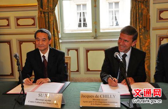 Su Xu (left) and Jacques de Chilly (right) sign the cooperative agreement on Nov 5, 2014.[Photo/culturalink.gov.cn] |