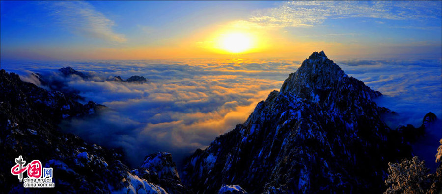 Mount Huangshan looks pretty in all seasons, but it is especially beautiful in winter, when numerous ravines, peaks, pines, pools and rocks are covered with ice or snow, and the mountain range becomes a silver fairyland. The glittering and translucent spectacle in the sunshine resembles a crystal palace. [China.org.cn]