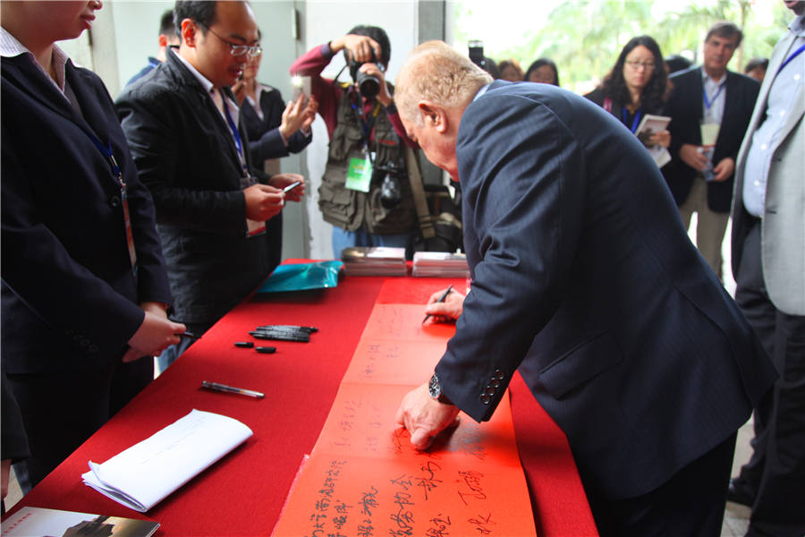 GhanimTaha Ahmed AL.Shibli, ambassador of the League of Arab States, signs his name at the entrance to Quanzhou Maritime Museum. [Photo by Xing Xudong/chinadaily.com.cn]