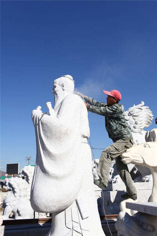A craftsman works on a sculpture of Confucius in Tiangang town, Jilin province, Oct 13, 2014. [Photo by Bai Shi/Asianewsphoto]
