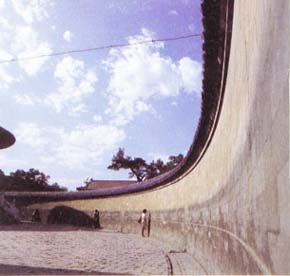 The circular wall surrounding the Imperial Vault of Heaven is 193.2 meters long, 3.7 meters high and 0.9 meter thick. If one speaks against the wall at one end, another can hear his voice at the other end of it. The Nine-Dragon Cypress outside the Echo Wall was planted 500 years ago. Its twining branches look like nine dragons.