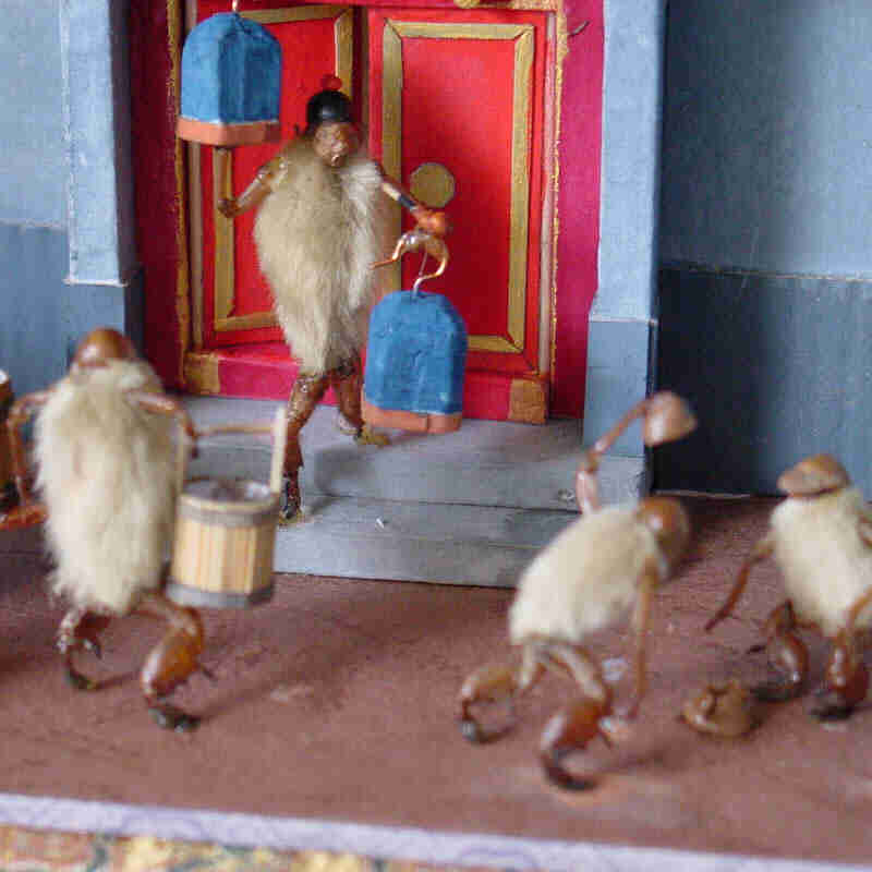 It is well known to old Beijingers that there used to be craftsmen selling hairy monkeys at the small and large temple fairs, in the Dong'an market and around the Front Gate. Cao, who fell in love with the small toys when a little boy, often went to the Dong'an Market to gaze at them.