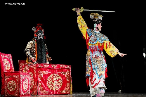 Performers from the National Academy of Chinese Theater Arts present Peking Opera in Vilnius, Lithuania, on Nov. 28, 2014. The Confucius Institute of Vilnius University held week-long activities for promoting Chinese culture from Nov. 24. [Photo/Xinhua]