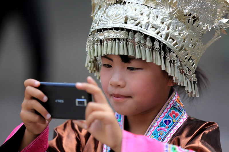 A child wears a silver headdress at Xiangfen village, Rongshui Miao autonomous county, Liuzhou, Guangxi Zhuang autonomous region, Oct 26.[Photo by Tan Kaixing/asianewsphoto.com]