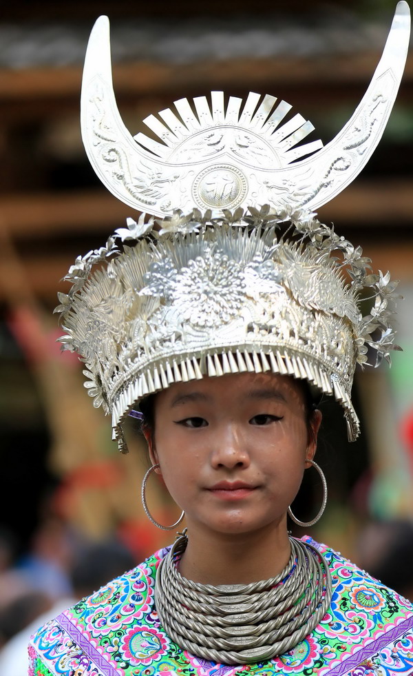 A girl wears a silver headdress at Xiangfen village, Rongshui Miao autonomous county, Liuzhou, Guangxi Zhuang autonomous region, Oct 26.[Photo by Tan Kaixing/asianewsphoto.com]