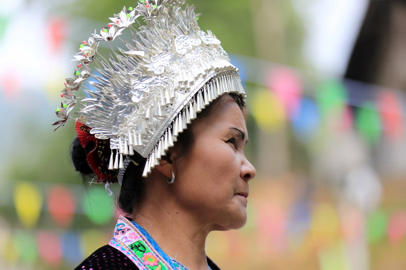 A woman wears a silver headdress at Xiangfen village, Rongshui Miao autonomous county, Liuzhou, Guangxi Zhuang autonomous region, Oct 26.[Photo by Tan Kaixing/asianewsphoto.com]