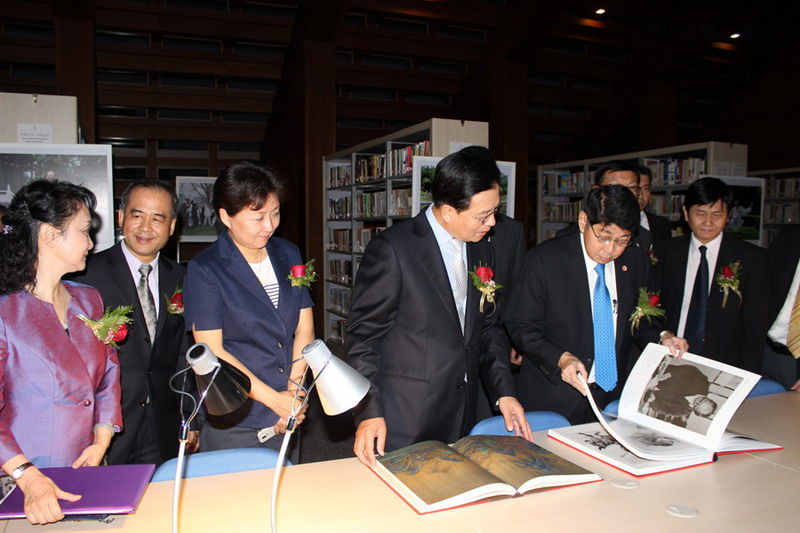 Wissanu KreaNgam (right) and Ning Fukui (left) turn the page of a book for the opening ceremony of the library in the cultural center. [Photo/culturalink.gov.cn]