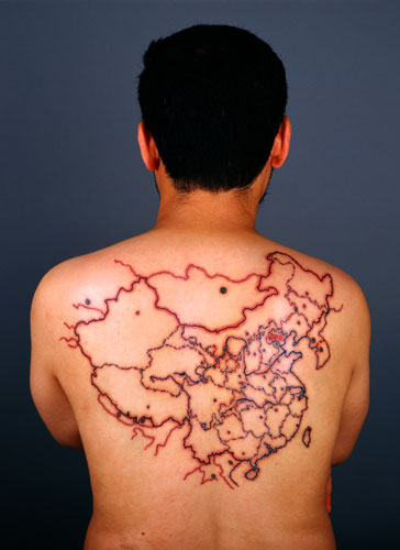 The Miniature Long March -- Beijing 2002. Photographs and videos of Qin Ga retrace the Long March, memorializing each site of pilgrimage on the map of China tattooed on his back.[Photo/China.org.cn] |
