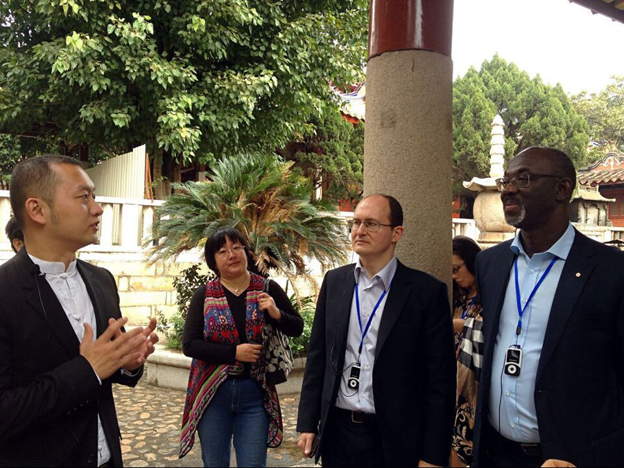 Touring diplomats learn about the Kaiyuan temple.[Photo by Hu Zhe/chinadaily.com.cn]