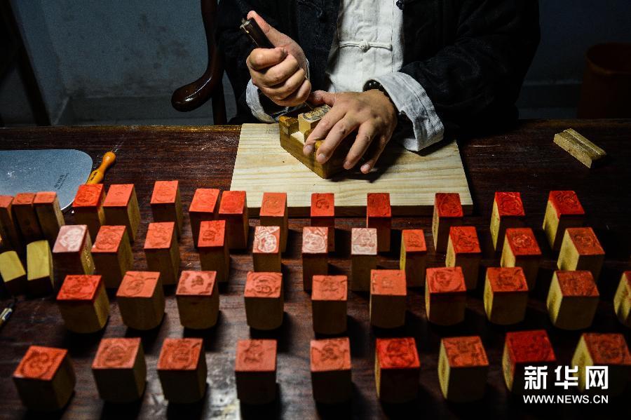Wei carves a seal. [Photo/Xinhua]