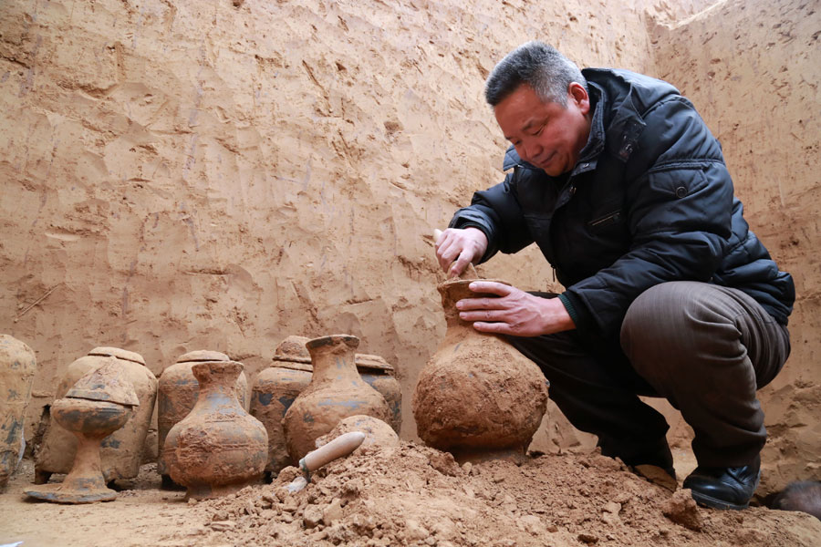 A staff member of the archaeological team cleans a burial object in a tomb lately discovered at a construction site in Wenxian county of Central China's Henan province on Dec 11, 2014. [Photo by Xu Hongxing/Asianewsphoto]