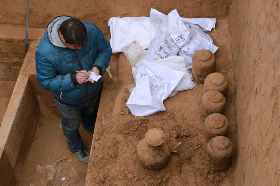A staff member of the archaeological team make notes of unearthed cultural relics in a tomb lately discovered at a construction site in Wenxian county of Central China's Henan province on Dec 11, 2014. [Photo by Xu Hongxing/Asianewsphoto]