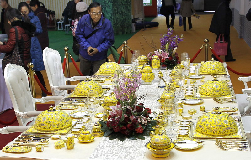 A visitors takes in the tableware sets used at the APEC welcome banquet at the 9th ICCIE in Beijing, Dec 11.[Photo by Zhu Xingxin/asianewsphoto.com]