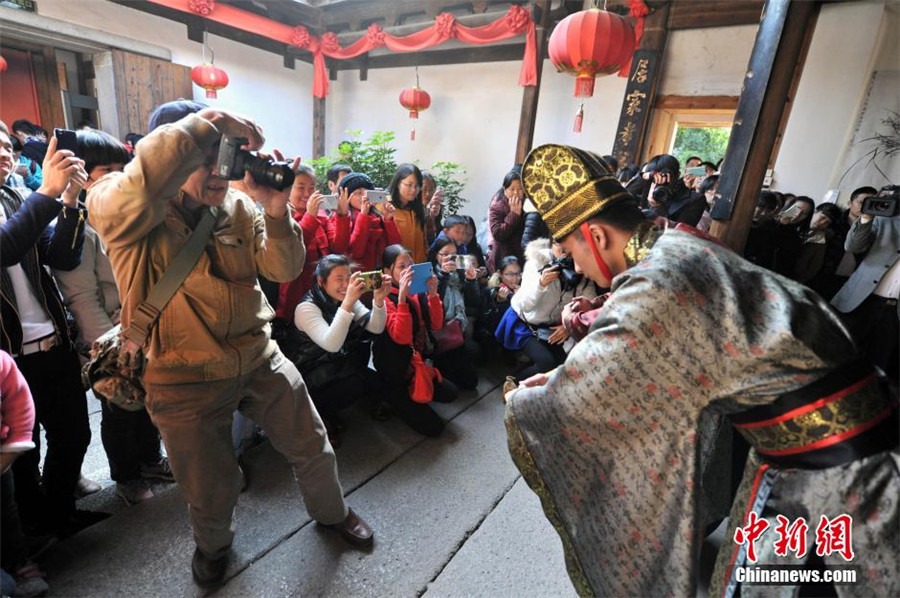Students wearing Hanfu demonstrate the ancient coming-of-age ritual at Fuzhou Folk Museum in Fuzhou, capital of Southeast China's Fujian province, on Dec 13, 2014. [Photo/Chinanews.com]