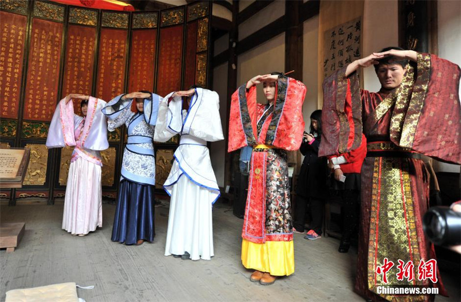 Students wearing Hanfu demonstrate the ancient coming-of-age ritual at Fuzhou Folk Museum in Fuzhou, capital of Southeast China's Fujian province, on Dec 13, 2014. [Photo/Chinanews.com]