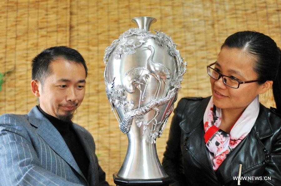 Zhuang Yaxin and her husband Zheng Tiansi, both tin carving artisans, present an award-winning work at their studio in Xiamen, Southeast China's Fujian province, Dec 26, 2014. [Photo/Xinhua]