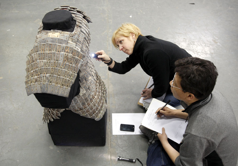 Two experts examine stone amour and record their inspection in Xi'an, Shaanxi province. Some of the famous Terracotta Warriors of the Qin Dynasty from China's city of Xi'an in Shaanxi province were exhibited at the Children's Museum of Indianapolis in the United States from May 10 to November 2. The exhibition displayed 265 items among which 18 were first-class cultural relics. [Photo by Chen Tuanjie/Asianewsphoto]