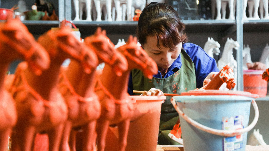 Three-colored glazed pottery of the Tang Dynasty represents the highest level of porcelain production in ancient China. It was one of the key goods traded on the Silk Road. In a factory in Luoyang in Henan province, workers are making the artworks. [Photo by Jiang Bin / China Daily]