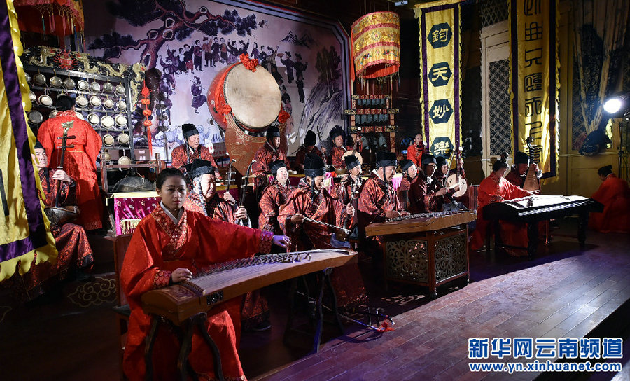 A photo shows the performence of ancient instrument in the Gongchen tower before it was destroyed by fire on Jan 3, 2015. [Photo/ yn.xinhuanet.com]