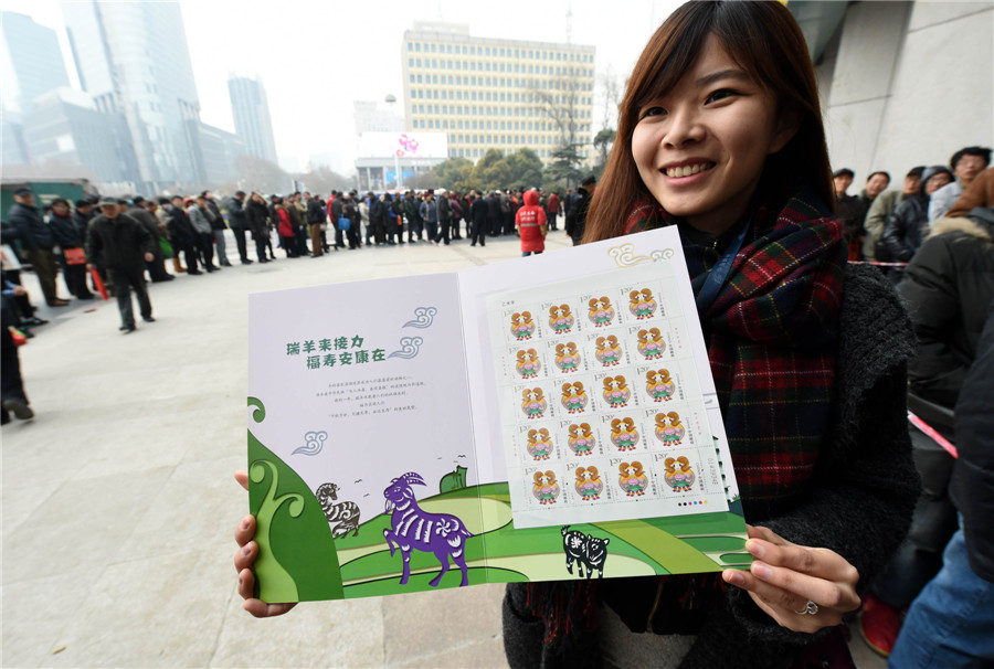 A woman shows a set of Yiwei Year special stamps for the Year of the Sheep in Nanjing, capital of East China's Jiangsu province, Jan 5, 2015. [Photo/Xinhua]