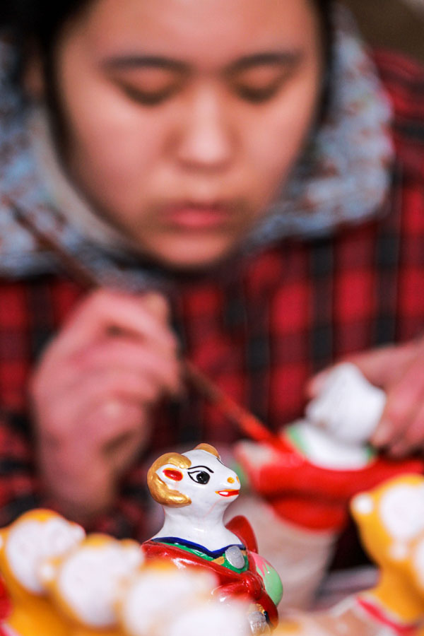 Folk craftsman makes a goat shaped "clay coo-coo" for the temple fair during the Spring Festival in Yangqitun village, Xunxian county, Central China's Henan province, Jan 11, 2015. [Photo by Wang Zirui/asianewsphoto.com]