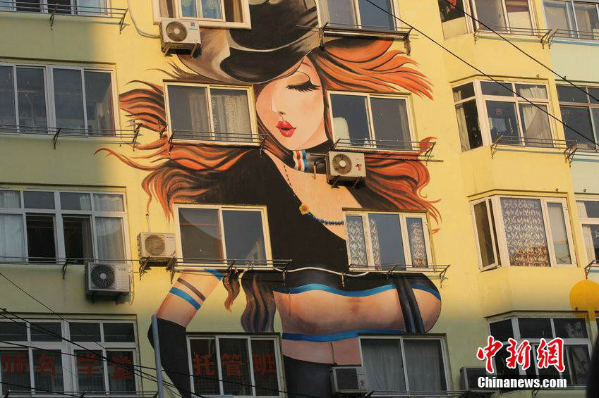 A wall painting of a sexy woman is on the side of a building in the downtown area of Qingdao, Shandong province, Jan 14, 2014. [Photo/Chinanews.com]