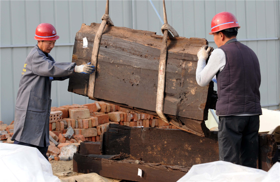 Archeologists take the coffin out of the Wangshanqiao No. 1 Chu tomb in Jingzhou city, Central China's Hubei province, Jan 17, 2015. [Photo by Chen Liang/asianewsphoto.com]