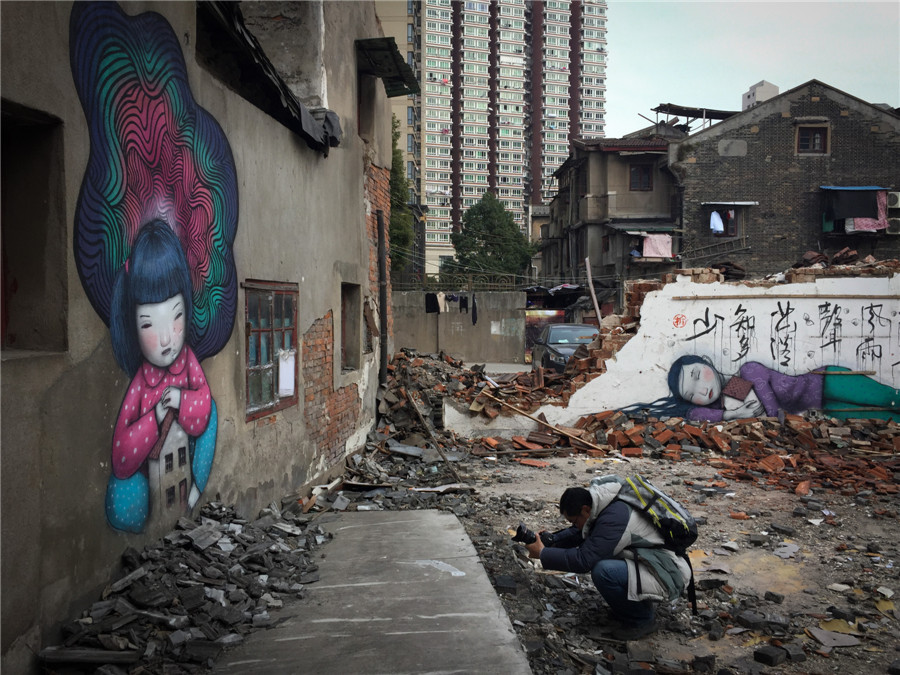 A man takes a photo of graffiti on the wall of a dismantled building in the Shikumen area of Shanghai on Jan 20, 2015. [Photo by Gao Erqiang/asianewsphoto.com]