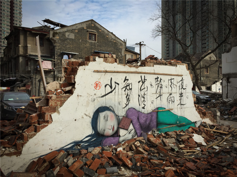 A graffito on the wall of a dismantled building in the Shikumen area of Shanghai on Jan 20, 2015. [Photo by Gao Erqiang/asianewsphoto.com]