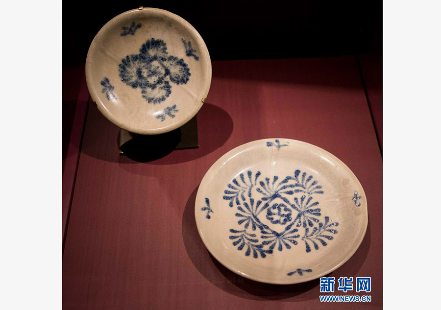 Tang Dynasty white and blue dishes salvaged from the shipwreck. [Photo/ www.news.cn ]