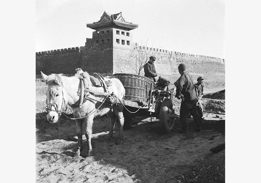 In March 1951, workers transport horse manure by wagon to a fertilizer factory in Beijing. [Photo/ Agencies]