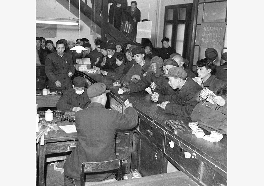 A photo of the Beijing Branch of the People's Bank of China shows the crowd exchanging their money when the government issued a new version of RMB in March 1955. [Photo/ Xinhua]