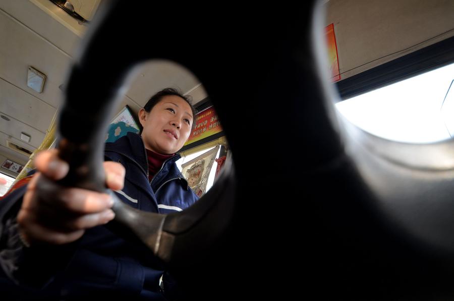 A bus driver works in Handan city, Hebei province on the first day of the lunar year. Many people continue to work during the festival period, Feb 19.[Photo/Xinhua]