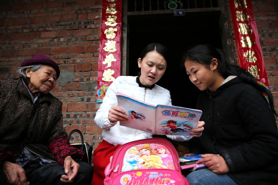 Qiao Yingchun, center, tutors Wang Ping with her homework. Wang is a student from a poverty-stricken household in Sanchahe village, Yanghe town, Huaying city in Sichuan province, Feb 24.[Photo/Xinhua]