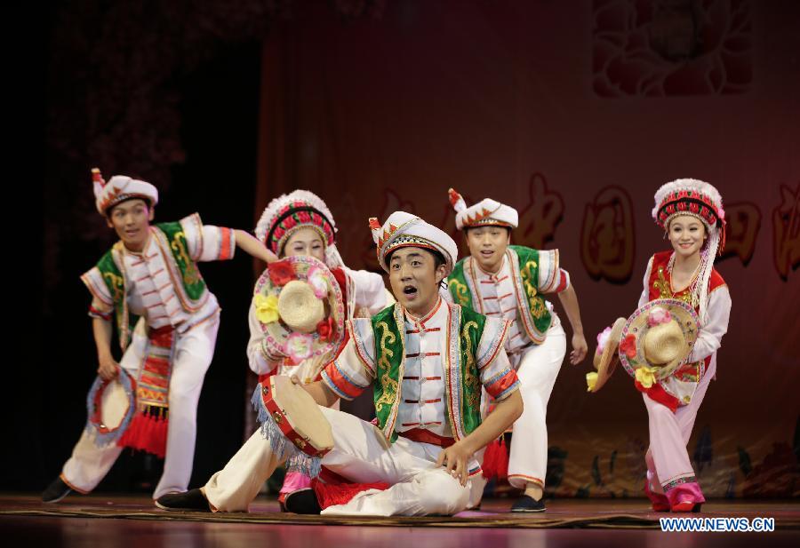 Chinese artists perform a Myanmar traditional dance during the "Cultures of China, Festival of Spring" performance at the National Theater in Yangon, Myanmar, Feb 24, 2015. [Photo/Xinhua]