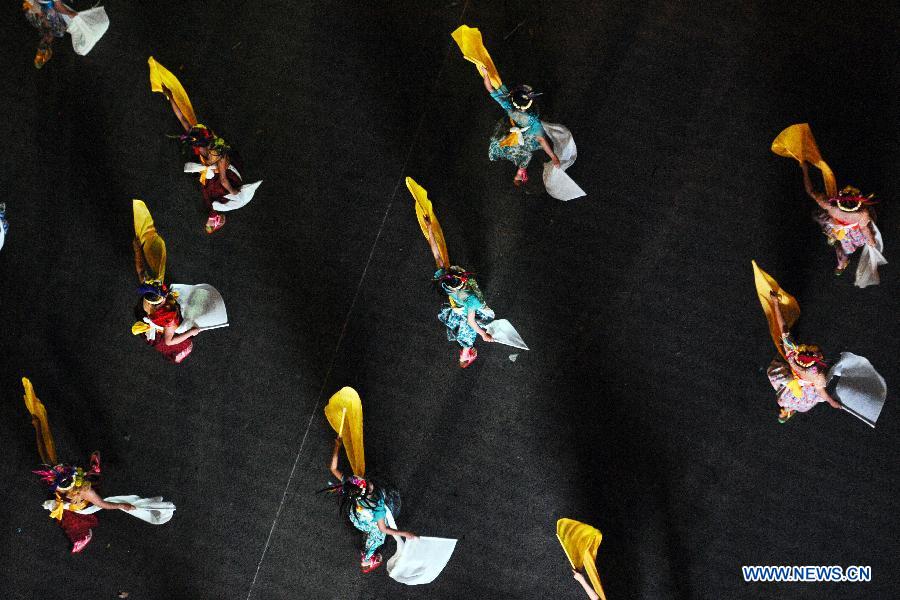 Performers attend a rehearsal at Singapore's F1 Pit Building, Feb. 26, 2015. The 2015 Chingay Parade held its last full scale rehearsal on Thursday before the actual parade on Feb. 27 and Feb. 28.[Photo/Xinhua]