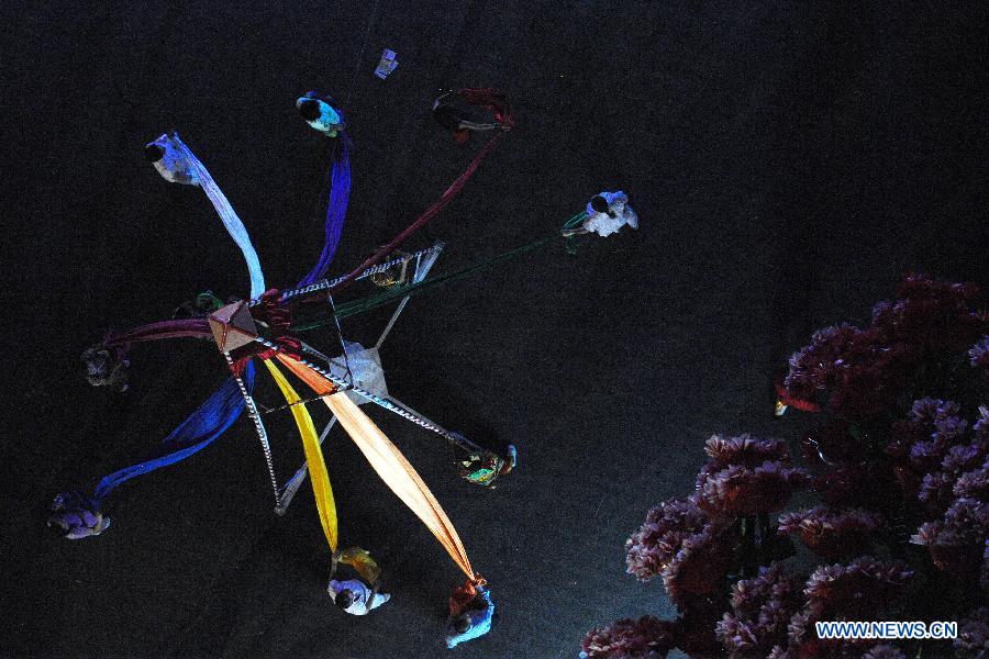 Performers attend a rehearsal at Singapore's F1 Pit Building, Feb. 26, 2015. The 2015 Chingay Parade held its last full scale rehearsal on Thursday before the actual parade on Feb. 27 and Feb. 28.[Photo/Xinhua]