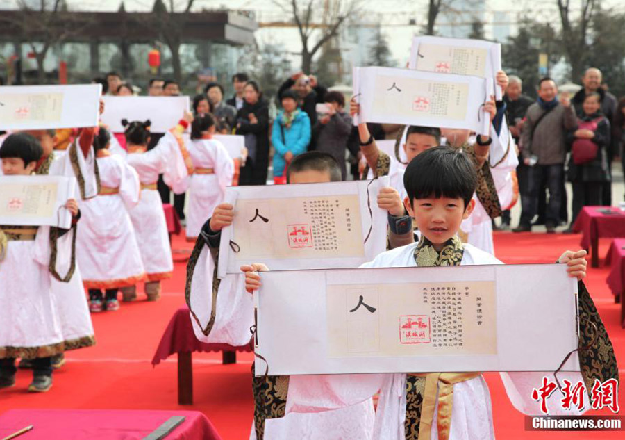 A Han-style First Writing Ceremony is held in Xi’an city, Shanxi province, on March 1, 2014. More than 50 children from Xi’an are attending the event to experience the traditional Chinese culture. [Photo/ Chinanews.com]