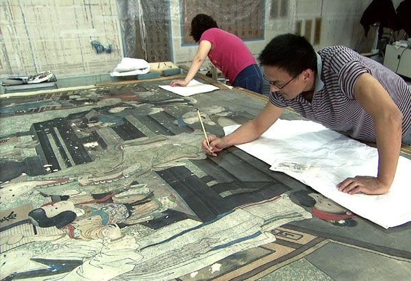 Artisans repair ancient paintings at the museum. [Photo/China Daily] |