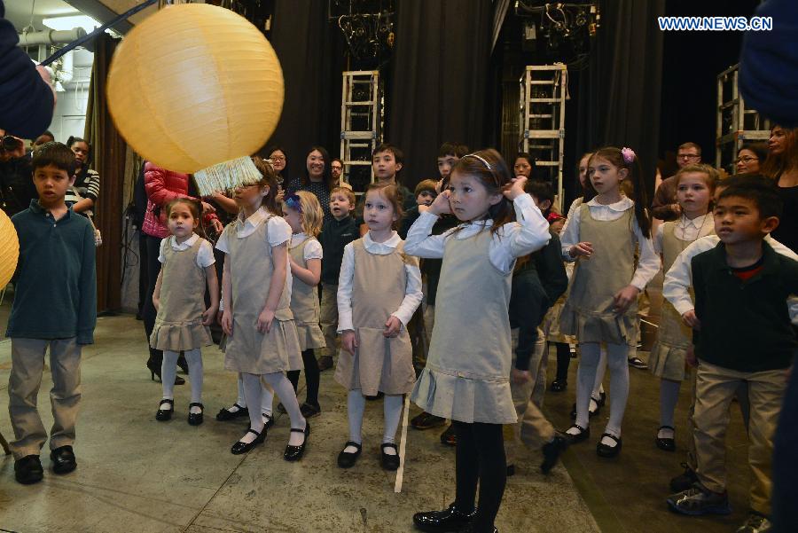 Local children rehearse chanting "The Ballad of Mulan", a Chinese poem eulogizing Hua Mulan, the legendary woman warrior in Chinese ancient history, ahead of the Chinese dance show Legend of Mulan at the Lincoln Center in New York, the United States, March 8, 2015. A total of 36 local children came to the stage and chanted "The Ballad of Mulan" on Sunday, wrapping up the dance show's three-day performance at the Lincoln Center. These children, aged from four to twelve, are from Hudson Way Immersion School and have been learning Mandarin since the age of two.[Photo/Xinhua]