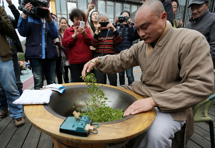 Monks dry tea leaves, using traditional procedures, at Fajing Temple. [Photo by Liu Yunlong/China Daily]