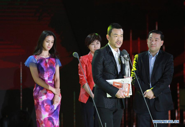 Liao Fan (second right), winner of the Actor of the Year award for his movie "Black Coal, Thin Ice", speaks at the 2014 annual awarding conference of China Film Directors' Guild in Beijing, April 12, 2015. [Photo/Xinhua]