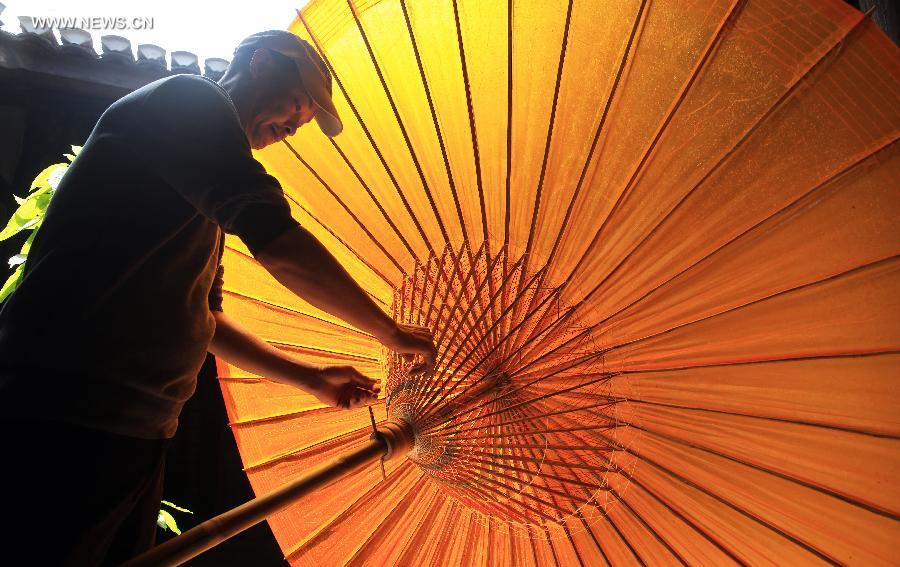 A villager makes an oil paper umbrella at Fenshuiling township in Luzhou city, southwest China's Sichuan province, April 12, 2015. The history of Luzhou's oil paper umbrella production can be traced back more than 400 years to the late Ming Dynasty(1368-1644). Its craftwork is now a state-level non-material cultural heritage and has over 70 steps, including bamboo-splitting, drilling, threading, paper cutting, gluing and sun drying. [Photo/Xinhua]