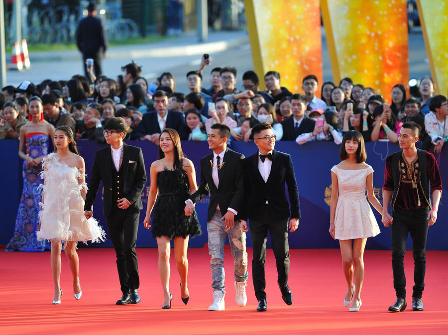 Actor-turned-director Alec Su (third from the right) and cast members of his directorial debut The Left Ear arrive at the red carpet for the 5th Beijing International Film Festival in Beijing on April 16. [Photo/Xinhua]