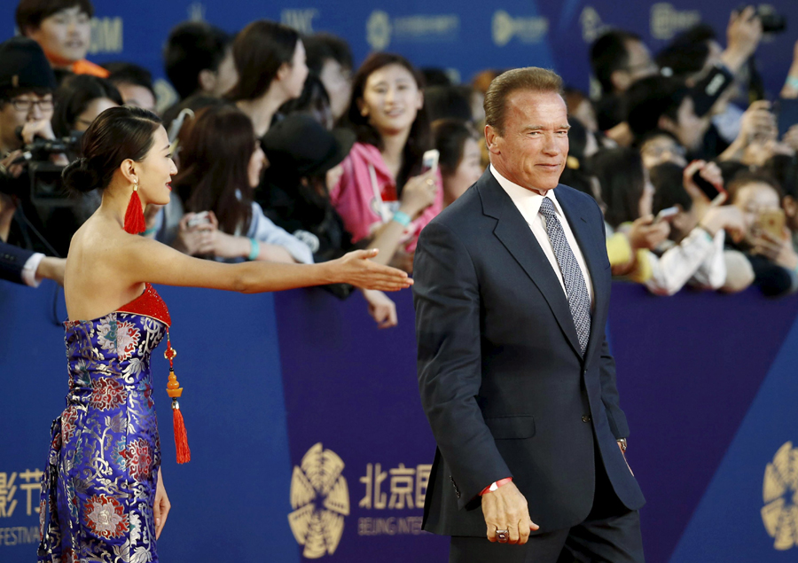 US actor Arnold Schwarzenegger walks on the red carpet at the Beijing International Film Festival at the National Center for the Performing Arts in Beijing, April 16, 2015. [Photo/Agencies]