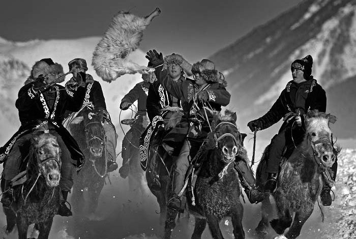 The Kazak men fight for a sheep in a competition, photo taken by Luo Pinxi in 2009. [Photo/ China Photographers Association] |