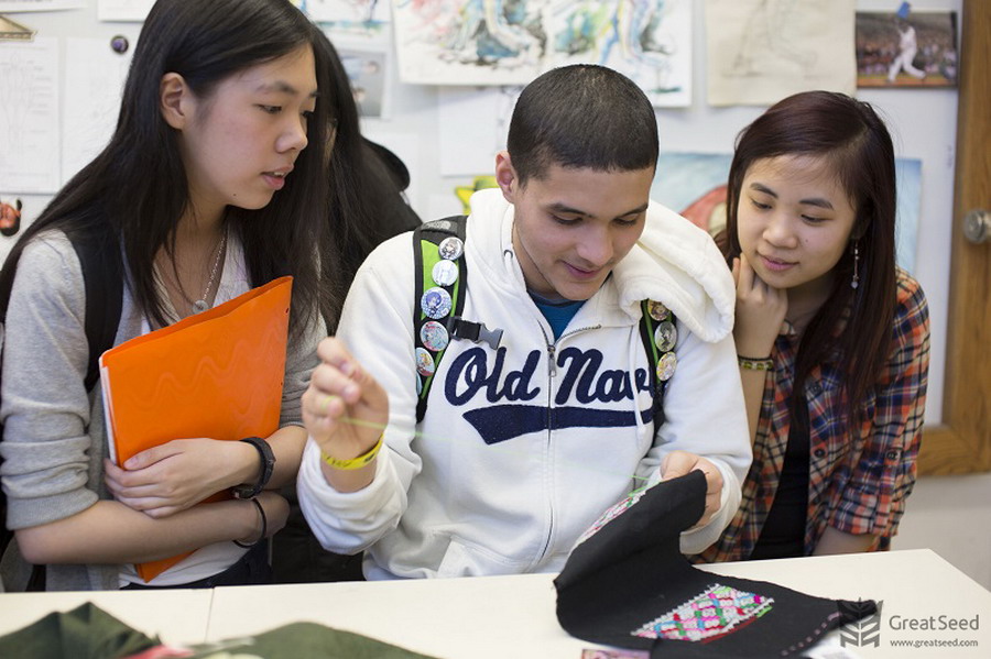 One student tries to follow suit after learning basic skills on Tibetan embroidery.[Photo provided by Great Seed Inc. (US)]