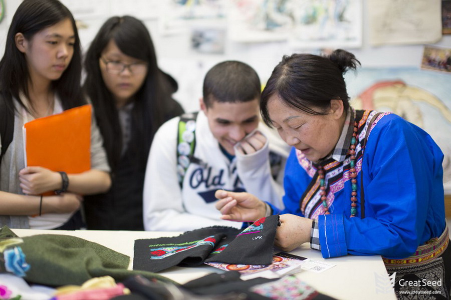 Students involve themselves in the learning of Tibetan embroidery, a traditional handicraft in China.[Photo provided by Great Seed Inc. (US)]