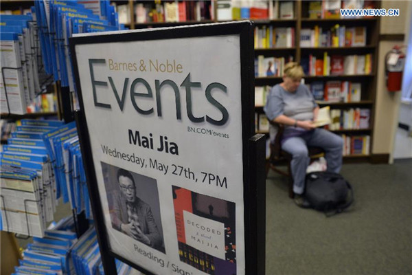 A poster showing the upcoming signing event of Chinese writer Mai Jia is seen at Barnes & Noble on the Upper West Side of Manhattan, New York, the United States, on May 26, 2015. [Photo/Xinhua] |