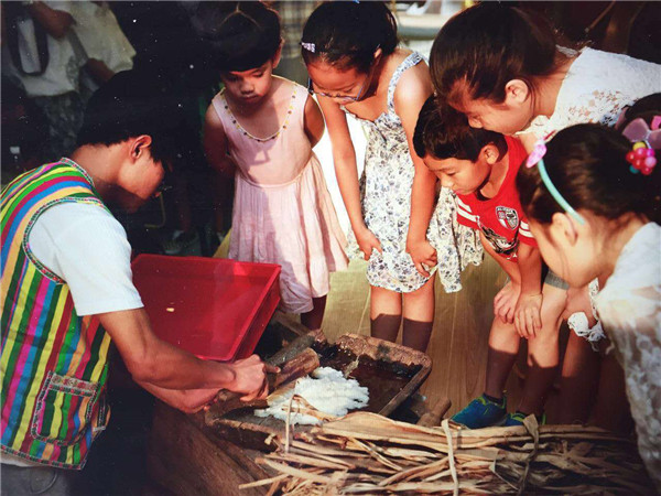 Children watch craftsman of the Dulong ethnic group from Yunnan province make paper at the activity, July 25, 2015. [Photo provided to chinadaily.com.cn]